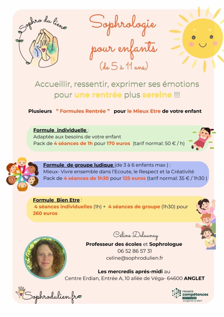 Les ateliers de sophrologie sont très bien. Les enfants travaillent sur les émotions et la respiration, tout en faisant des activitées manuelles intéressantes. Ma fille adore. Elle exprime plus ses émotions depuis qu'elle a fait son stage. Elle sait nous donner des conseils avec ce qu'elle apprend. Elle aime tellement y aller qu'elle nous a demandé de refaire un stage avec Céline. 100% validé