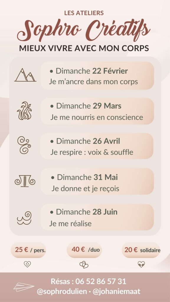 ✨ Nous avons décidé de co-créer ensemble avec nos compétences lumineuses d’art-thérapeute et de sophrologue — accompagnantes et enseignantes — pour vous offrir un espace de présence au corps, de créativité et de découverte de soi, à vivre ensemble, avec simplicité, joie et douceur.