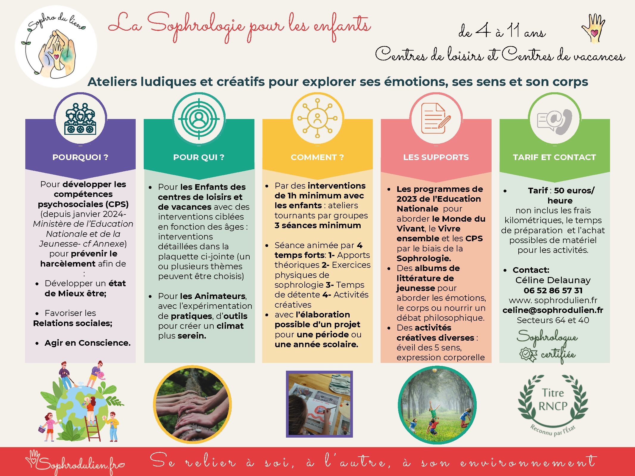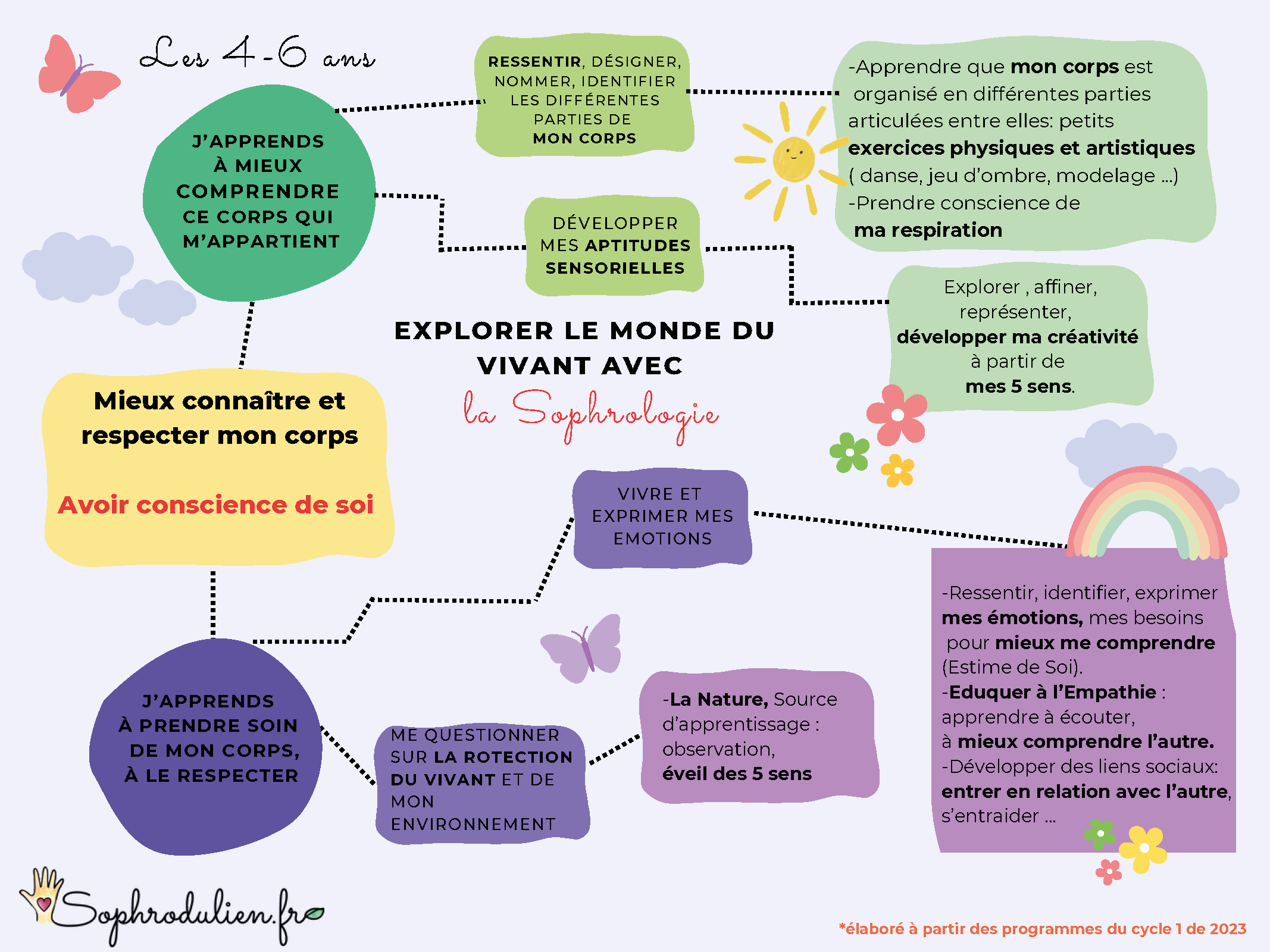 Convaincue de l’importance de développer davantage le « Savoir être à l’école », je propose des ateliers de sophrologie pédagogiques et ludiques en classe afin d’ accompagner l’enfant à accueillir, écouter ses émotions pour apprendre à mieux se connaître , à rentrer dans une  relation saine avec les autres (Empathie) et devenir plus conscient de ses dires et de ses actes.