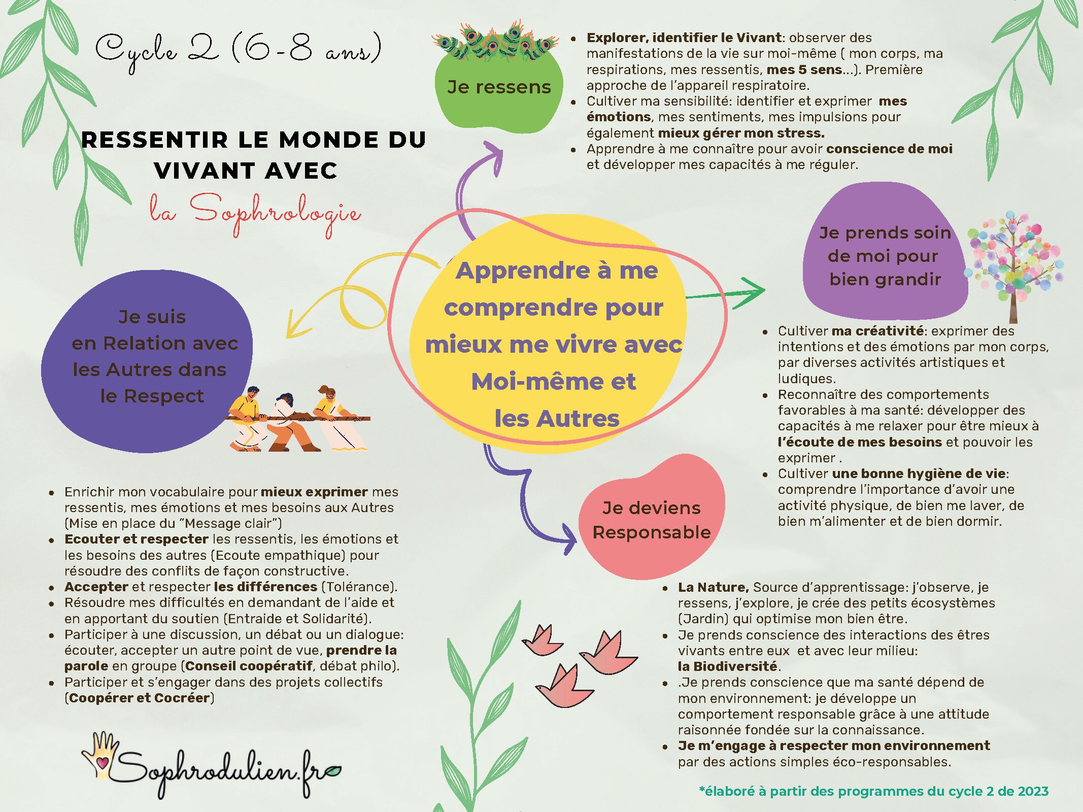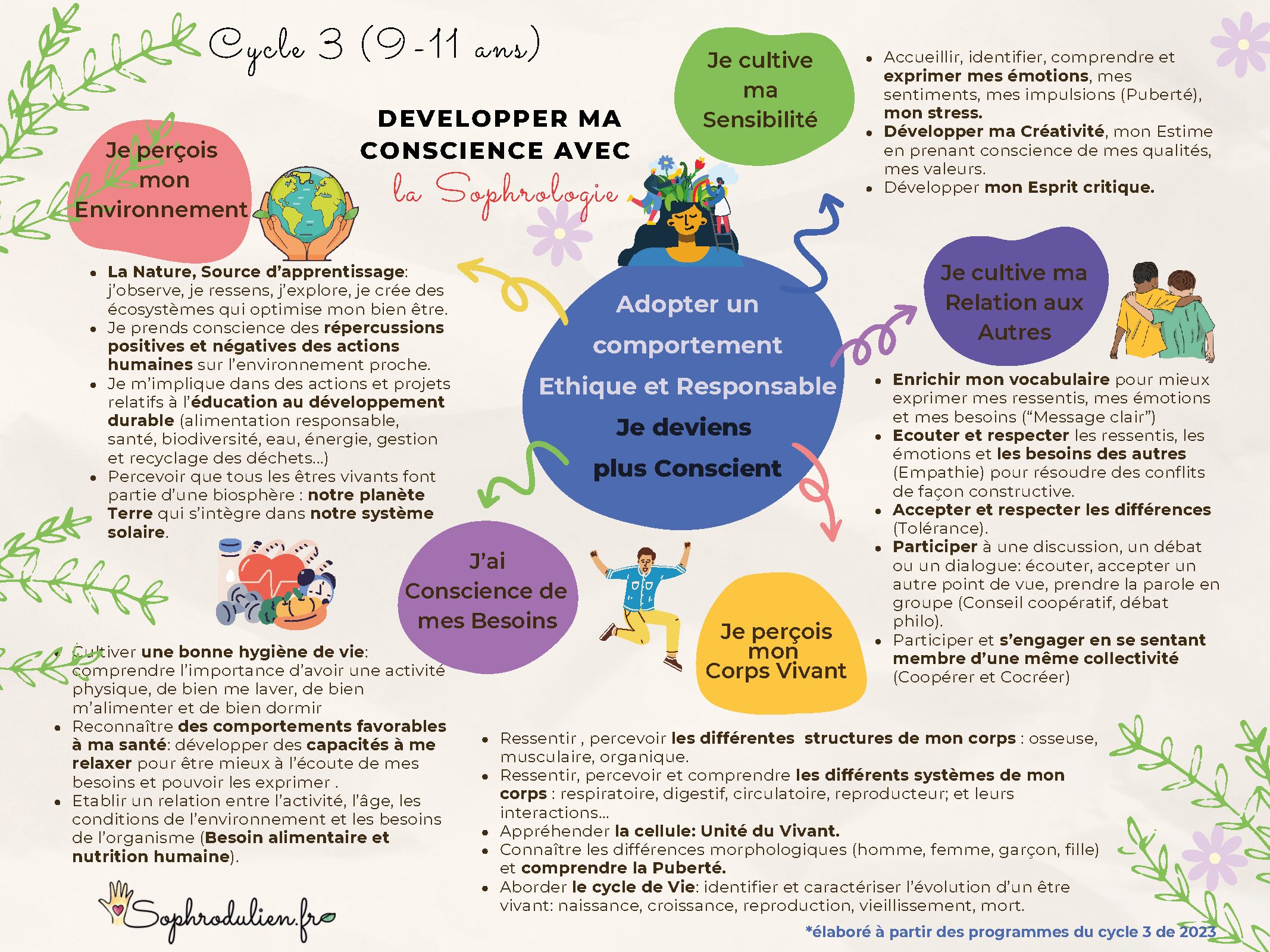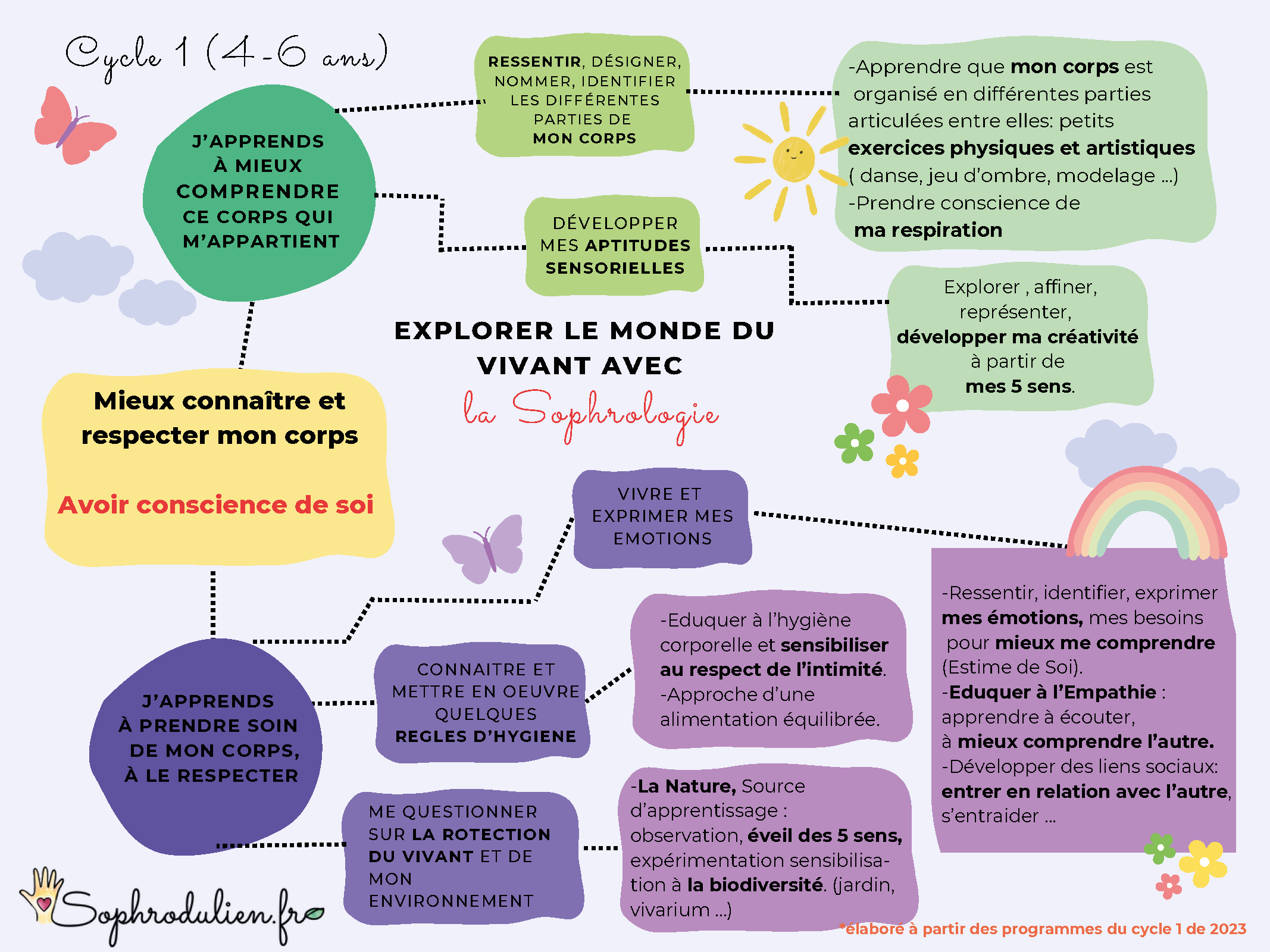 Cette double compétence professionnelle m’a permise de créer des interventions en lien avec les programmes de 2023 du Ministère de l’Education Nationale pour les trois cycles du primaire qui vous sont détaillées ci-dessous.